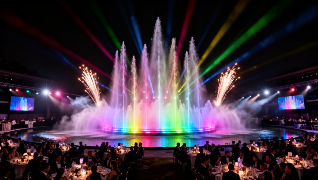 Ein besonderes Highlight sind unsere musiksynchronen Wassershows: Mit 60 fixen und beweglichen Düsen, einer Breite von bis zu 7 m und einer Höhe von bis zu 5 m inszenieren wir eindrucksvolle Choreografien – vergleichbar mit einer kleinen Las-Vegas-Show. Ideal für Messen, Einkaufszentren, Hochzeiten, Firmenanlässe und öffentliche Events.